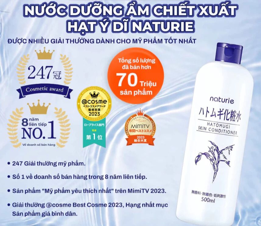 Naturie Hatomugi Skin Conditioner là sản phẩm chăm sóc da được tin dùng rộng rãi tại Nhật Bản và nhiều quốc gia châu Á. Với hàng triệu chai được bán ra mỗi năm, sản phẩm liên tục nằm trong top nước dưỡng ẩm bán chạy nhất trên Rakuten, Amazon Japan và các sàn thương mại điện tử lớn tại Việt Nam như Shopee, Tiktok Shop. Đây chính là lựa chọn lý tưởng cho người tiêu dùng đang tìm kiếm một giải pháp dưỡng ẩm an toàn, hiệu quả và lâu dài.