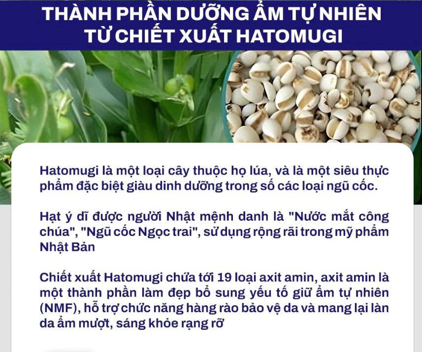 - Chiết xuất hạt ý dĩ (Hatomugi): Giàu amino acid, vitamin nhóm B và khoáng chất, hỗ trợ nuôi dưỡng, phục hồi và làm sáng da.